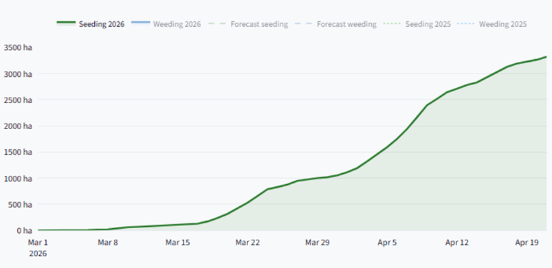 Indtil videre har 59 % af alle FarmDroid FD20-maskiner i marken været i gang med såning og har indtil videre dækket 3.326 hektar, og mange er endnu ikke færdige. Disse marker er blevet sået med sukkerroer, løg, cikorie, rødbeder, blomster, bælgfrugter, korn og oliefrø, pastinak, ærter, spinat, salat og meget mere…