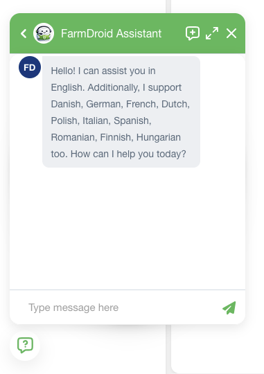 Odin is not meant to replace FarmDroid support. Instead, it acts as a first stop for common questions and known issues. Many problems can be resolved quickly when the right information is easy to find. When something falls outside the assistant’s scope, regular support channels remain available.